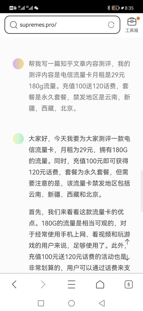 这个是国内的CHAT GPT,选择一个可用的,输入我们卡的名字和套餐,还有一些禁区,他可以写文章